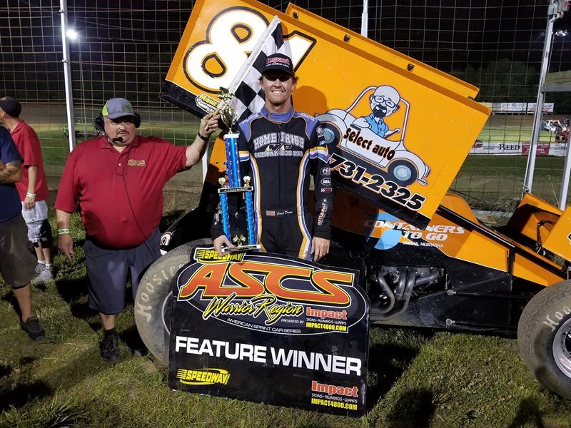 Bryan Hulbert – OSBORN, Mo. (June 8, 2018) For the 12th time with the Speedway Motors ASCS Warrior Region presented by Impact Signs, Awnings, and Wraps, Nebraska’s Jack Dover parked in Victory Lane, this time topping the Bud Shootout at U.S. 36 Raceway in the Select Auto No. 81.
